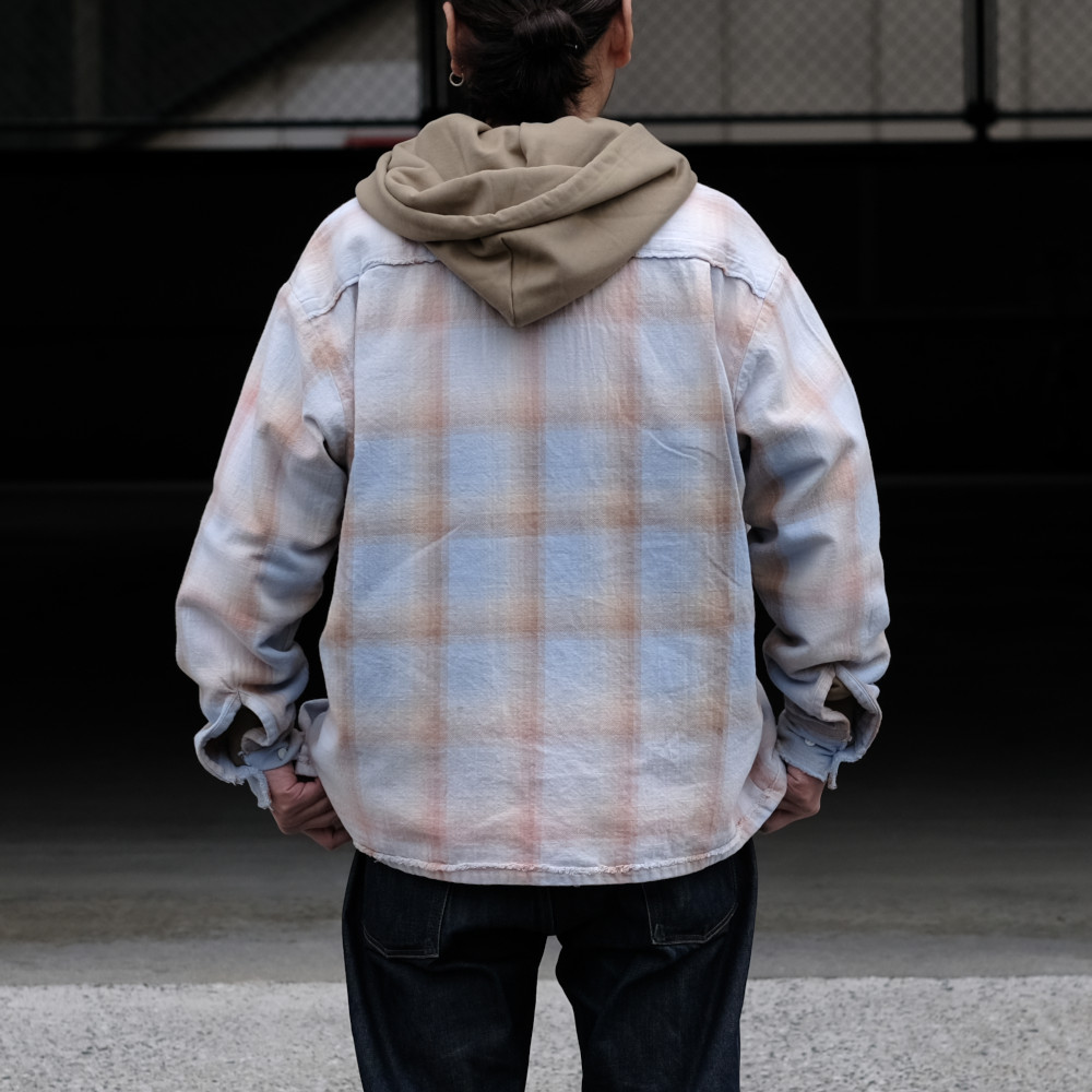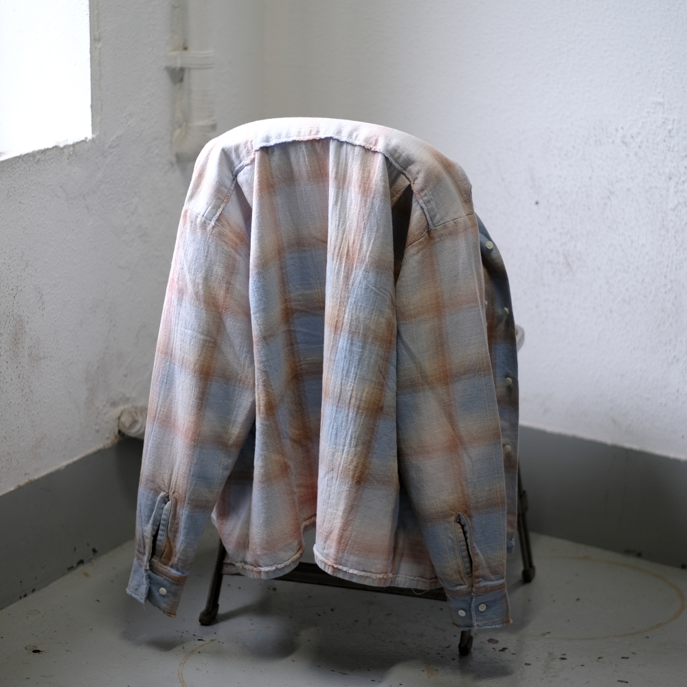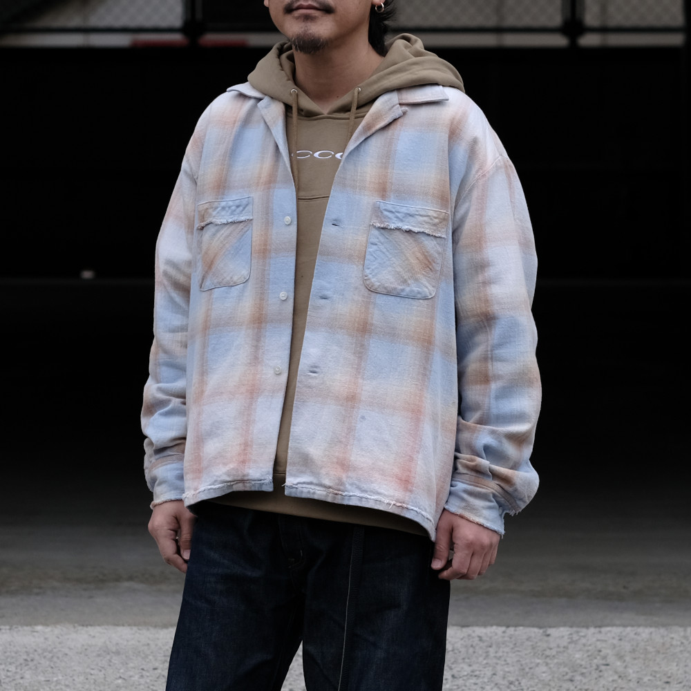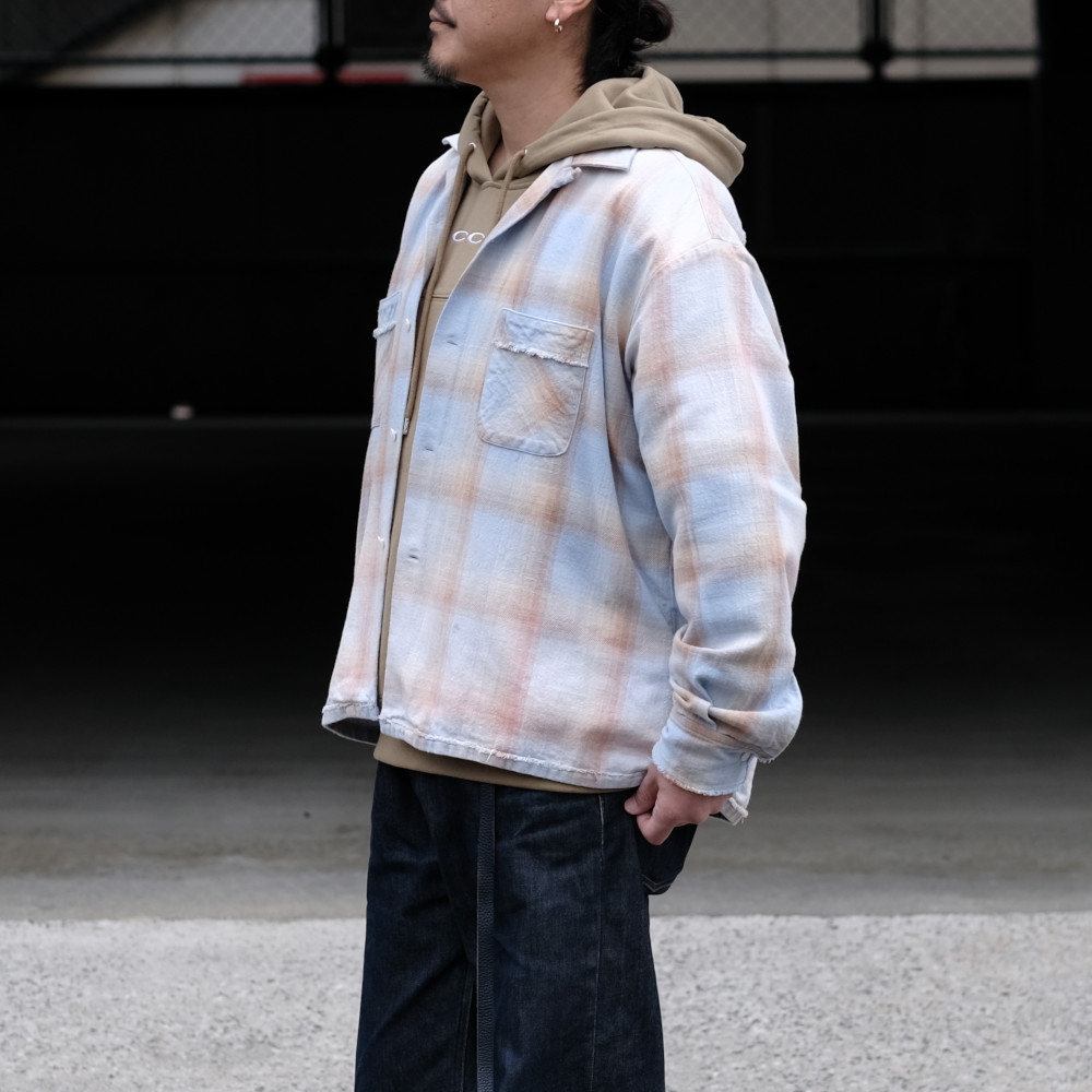 Name.(ネーム)のシャツです。オープンカラー型のチェックシャツ。短丈のボックスシルエット。 部分的にフェード加工とユーズド加工。 膨らみのあるツイルチェック。古い紡績機を使用することで生まれる自然なムラが特徴。