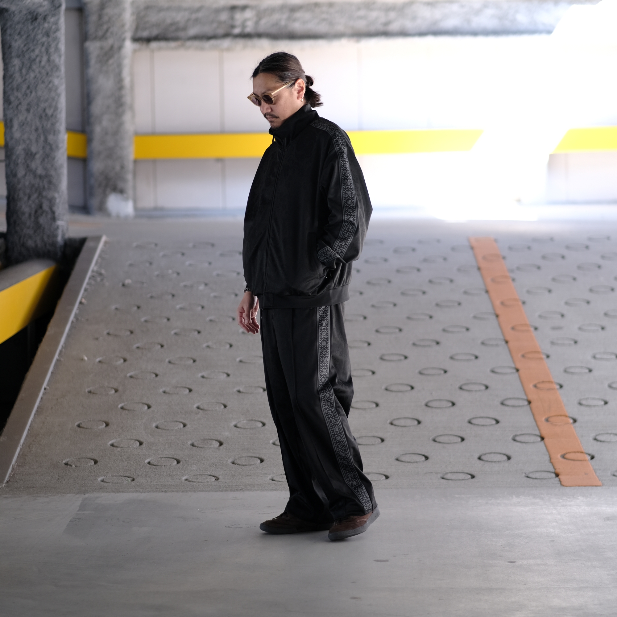 DELUXE(デラックス)とEVISEN がコラボレートしたトラックパンツです。ジャガードで表現したボタニカル柄オリジナル生地のトラックパンツ。背面右腰にロゴを直刺繍 側章にはEvisenらしいグラフィックで表現した刺繍テープ、両脇・背面左右にジップ付きスリットポケットを配置したデザイン。フロントの左右にベルトループを各1で付属。同生地で作成したトラックジャケットとセットアップで着用が可能。ピンタックの入るウエスト・腿回りにゆとりのあるシルエット。Evisenとのコラボレーションモデル。