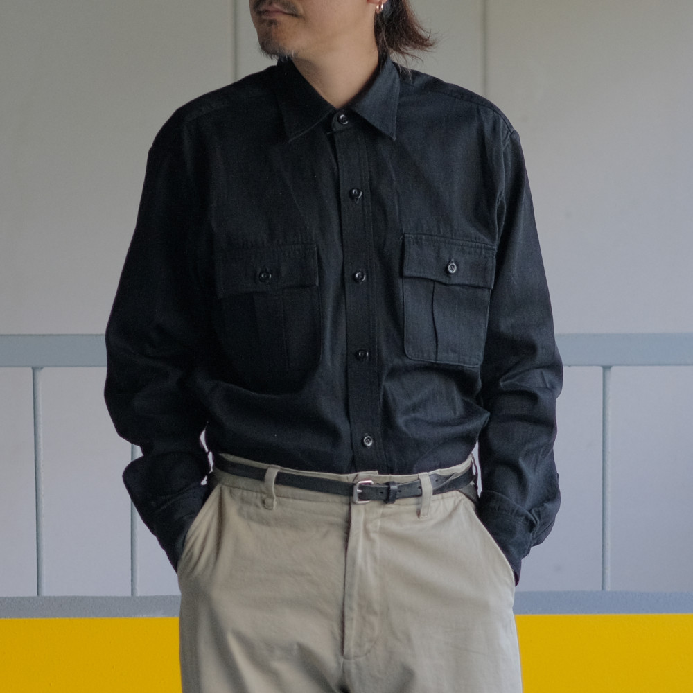 ミリタリーのオフィサーシャツから着想を得てつくられ、1940~60年代のアメリカ軍と思われるミリタリーシャツをMINEDENIMらしく、都会的でモードなデザインに昇華した1枚。