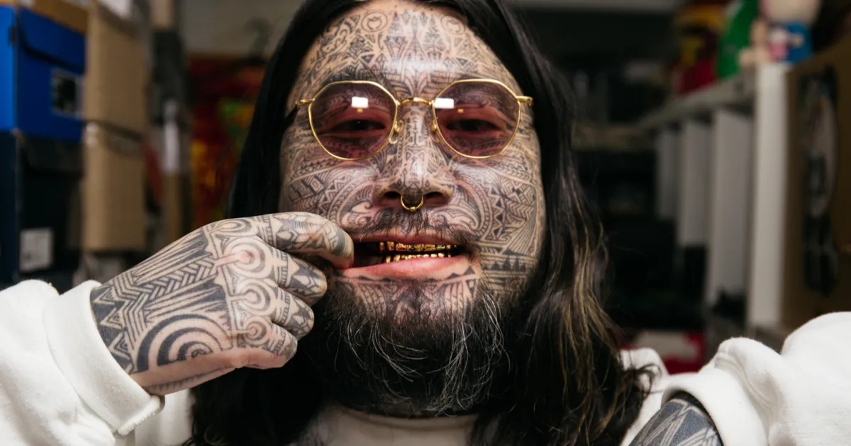 顔はもちろん、全身に彫られたタトゥーが存在感のあるデザイナーのNISHIMOTO氏。